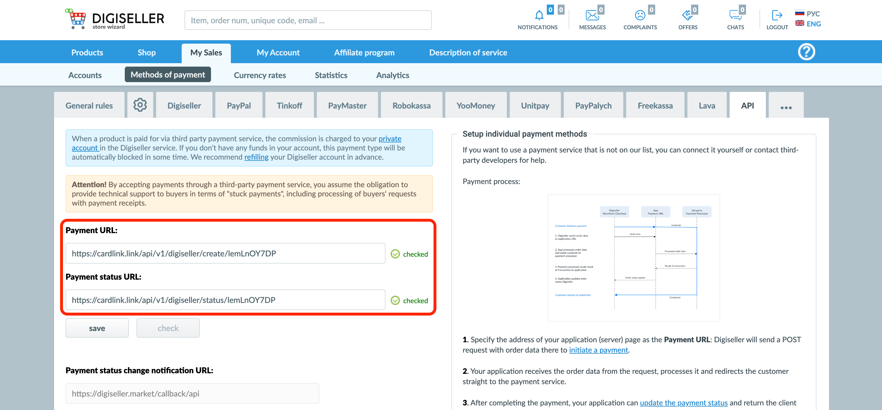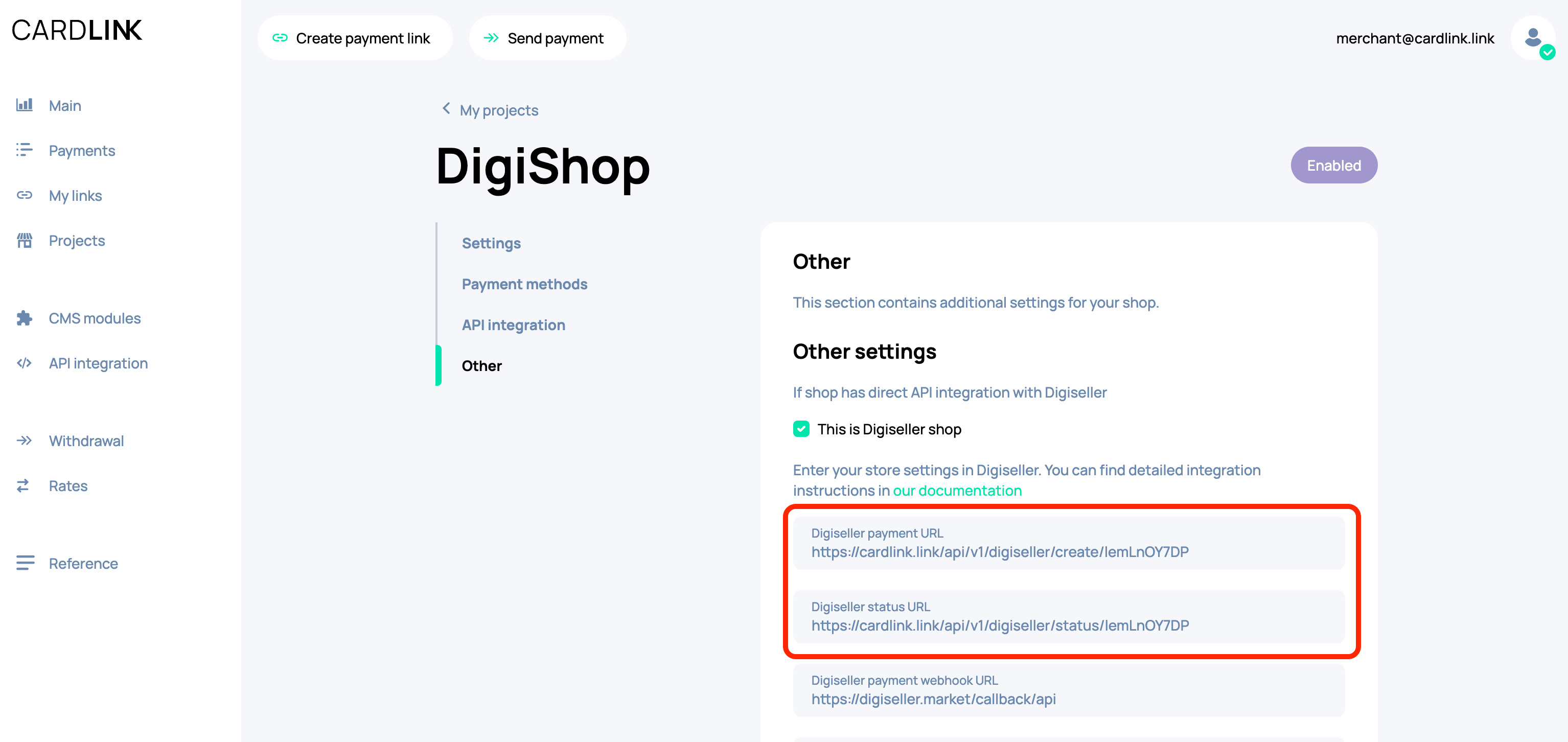 Go to your Digiseller account -> Payment methods -> API. On this page you need to fill in the fields Payment URL and Payment status URL. You can find them in your store settings in the «Other» section in cardlink.link.