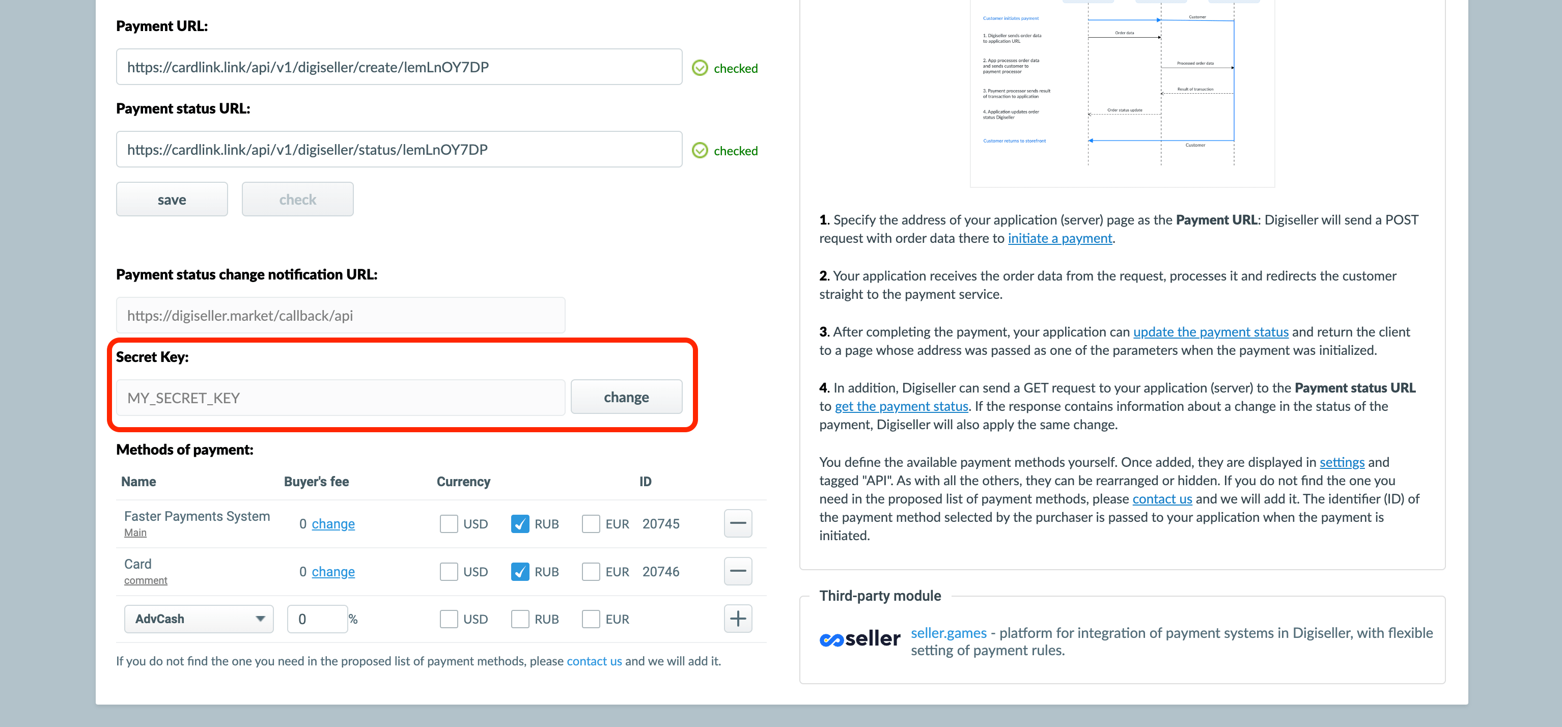 Copy the secret key and paste it into the «Secret key for Digiseller API» field in your store in cardlink.link