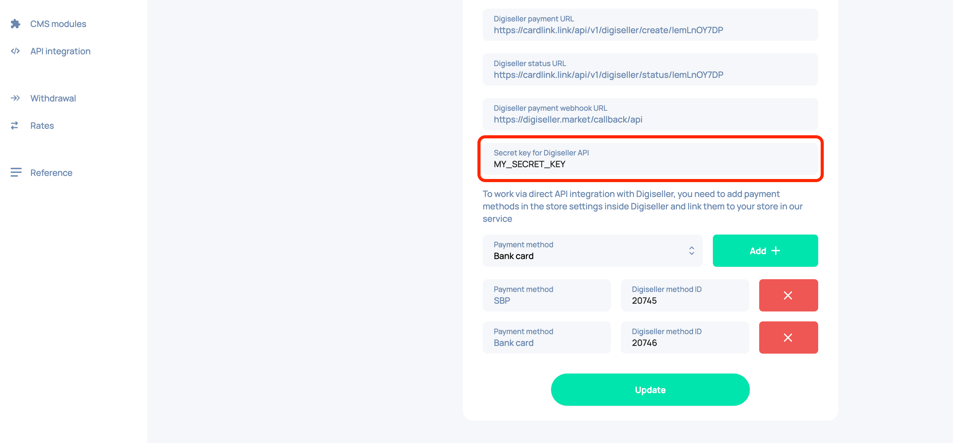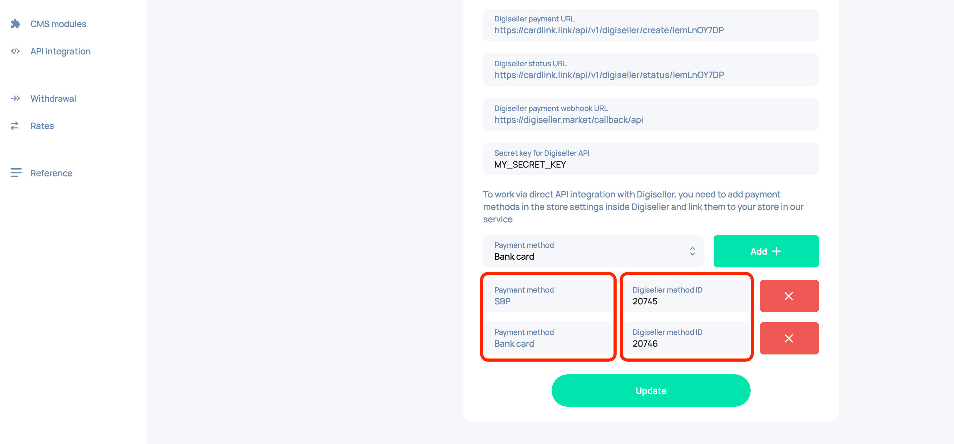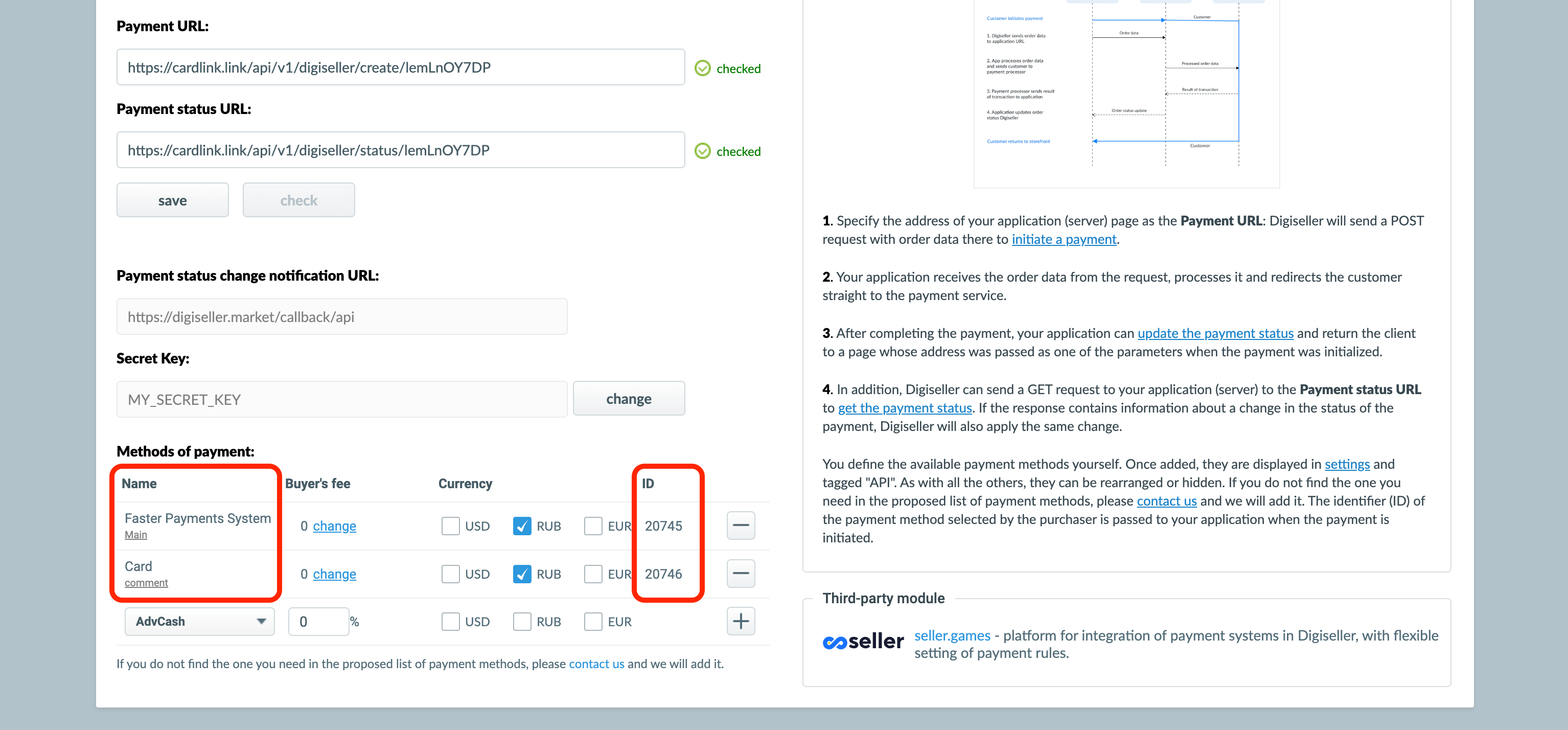 Set up the necessary payment methods. To do this, add and configure the methods you need on Digiseller, then specify their IDs according to the type in cardlink.link