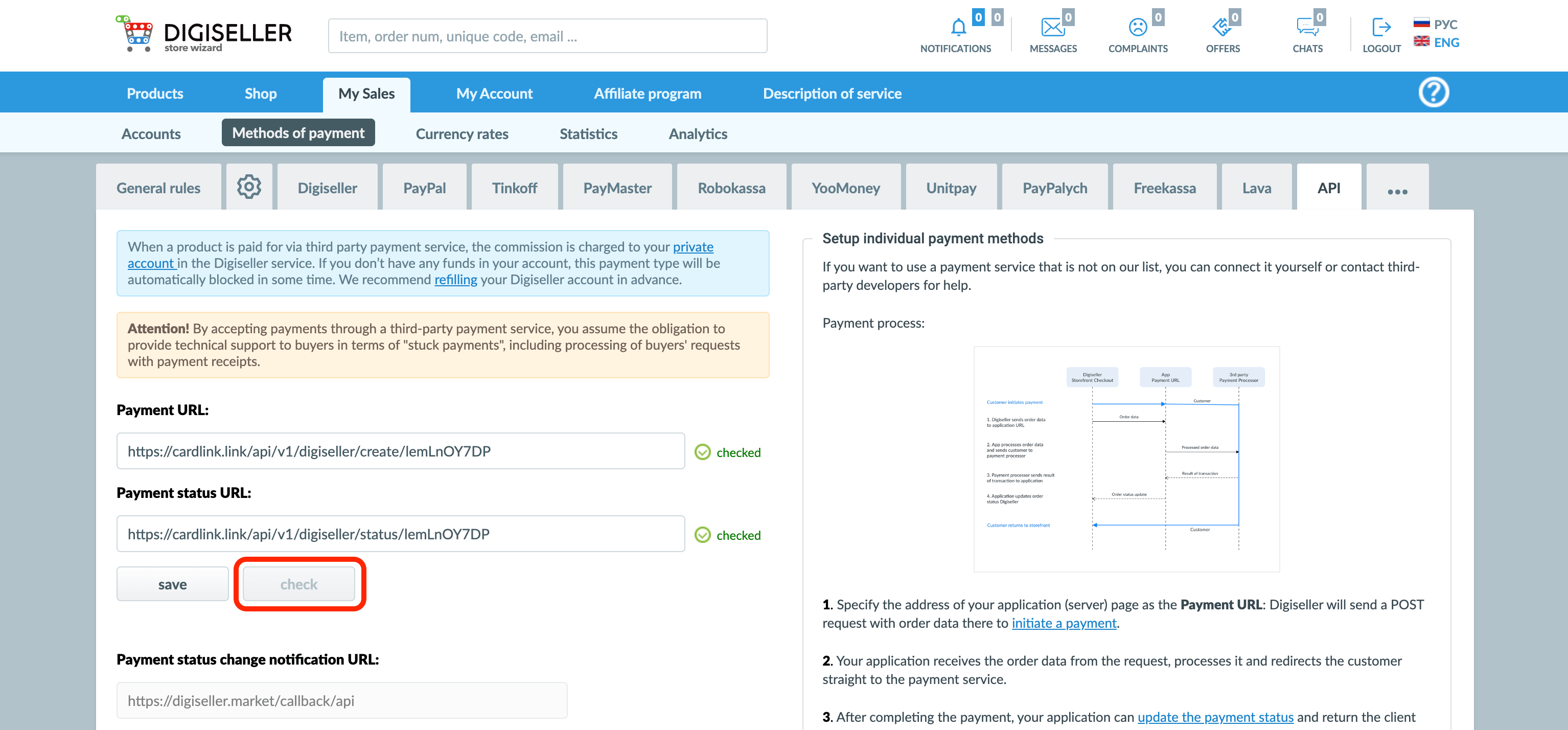 After adding all the necessary parameters to Digiseller, click the «Check» button and make sure that the check was successful. If you receive an error, contact cardlink.link technical support