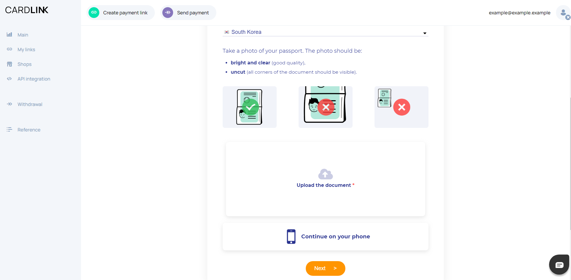 Photo of the main page of international passports ( no local passport of your country, not a scan, no "cropping" and Photoshop, not a plastic ID, only a paper document) as well as confirming the identity on the camera. You will need to show your face looking at the camera, turning your head to the right, to the left, down, up, until you receive a message about successful verification.