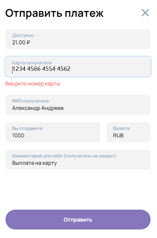 Если вам нужно отправить средства со своей учетной записи прямо на чью-то карту, функция Отправить платеж позволяет сделать это вручную в вашем личном кабинете, или автоматически через наш API. Обратите внимание, что автоматическая выплата через API по умолчанию отключена. Чтобы разблокировать её, обратитесь в нашу службу поддержки в чате.